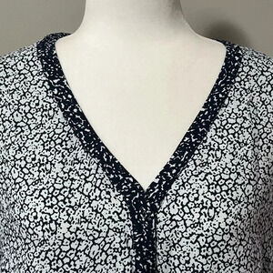 The daisy ditsy floral is a long sleeve button front blouse with a contrast print along hem, placket and cuffs, soft and relaxed body.