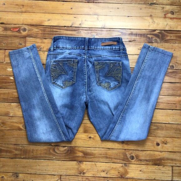 Casual distressed stretchy blue denim with embroidered back pockets.