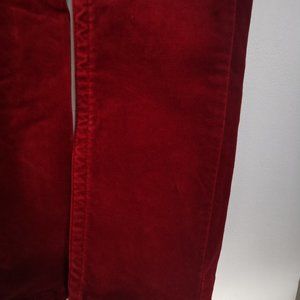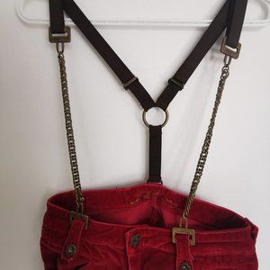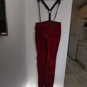 Size 5 Foxy jeans straight leg red velvet pants with detachable brass metal suspenders. Like new