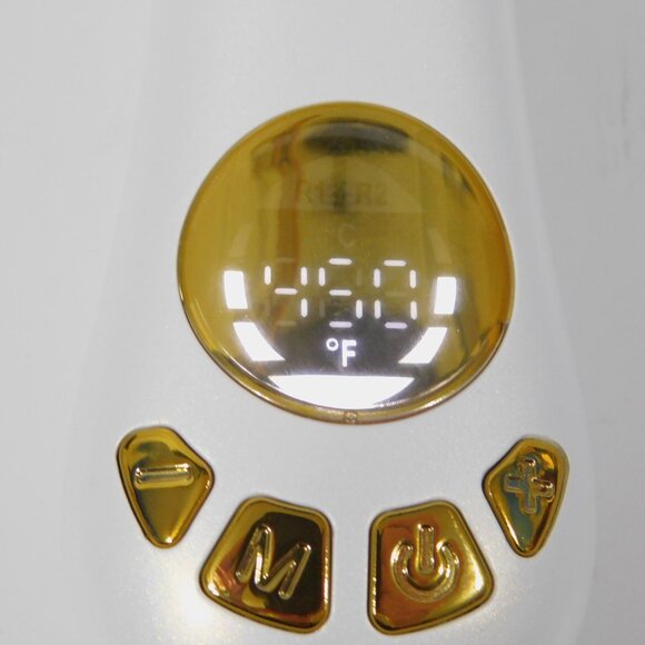 This hard to find Foxybae Twirl Boss Automatic Rotating Curling Iron Curl Wand in Pearl and gold is in Excellent clean working condition. Twirl Boss Pearl Gold Titanium Rotating curler is crafted with a professional-grade 1.25" titanium barrel, delivering frizz-free, shiny and long-lasting beachy curls even on the most challenging hair types. The barrel auto rotates in both directions, allowing for varied curl patterns, while making curling your hair easier and faster than ever! Set the temperature to match your hair type with digital heat setting up to 450°F, and enjoy stress-free styling sessions with the 360° swivel cord and auto shut-off safety feature. Dual voltage compatibility ensures you can stay foxy on the go with gorgeous, long-lasting curls at the tap of a button!