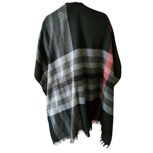 Stylish wrap with a plaid pattern. Features a striking red accent. Perfect for layering.