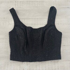 A stunning beaded corset style stop by Frame. Featuring a beautiful scoop neckline with a cropped hem. This top can by styled on its own or under a blazer. Designed with boning and a back zipper for structure, this top instantly elevates any outfit.