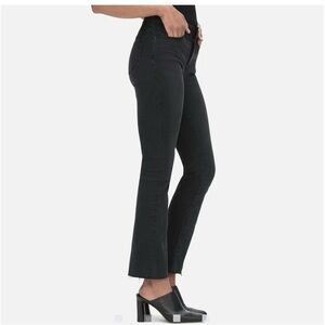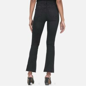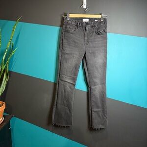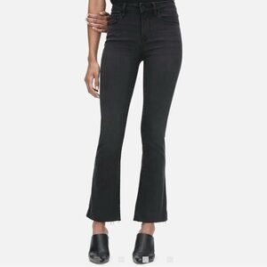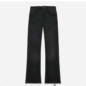 These Frame Denim jeans boast a chic black hue with a high-waisted fit that elegantly flares from the knee, creating a wide leg silhouette. The cropped length offers a contemporary twist, making them a versatile addition to any wardrobe. With their sleek, uniform wash, these jeans are perfect for adding a touch of sophistication to your ensemble.