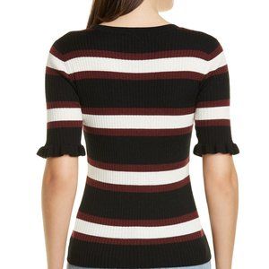 Stylish crew neck sweater. Features black, white, and red stripes. Short sleeves with ruffle detail.Good condition.