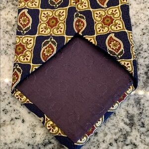 This sophisticated tie from Frame Denim features a striking blue and gold geometric pattern, perfect for adding a touch of elegance to any formal ensemble. Crafted with attention to detail, the tie's design includes alternating squares with intricate emblems, creating a timeless and refined look. Ideal for special occasions, this accessory is a must-have for those who appreciate classic style. 100 percent silk