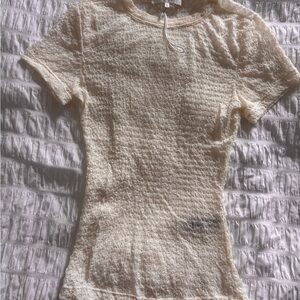 This cream top from Frame Denim features a smocked, fitted design with a classic polo collar and short sleeves. The lightweight fabric offers a comfortable fit, making it a versatile addition to any wardrobe. Has stretch to it.