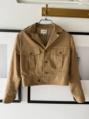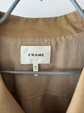 Frame Denim cropped utility jacket in a warm tan shade. Features a structured collar and button-front closure. Chest flap pockets and long sleeves. Clean, streamlined silhouette for everyday wear.