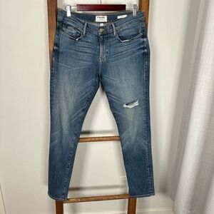 A frame signature jean with a comfortable mid rise waist that hits higher in the back and a relaxed taper through the leg. Crafted from sustainable stretch cotton blend with the softest hand.