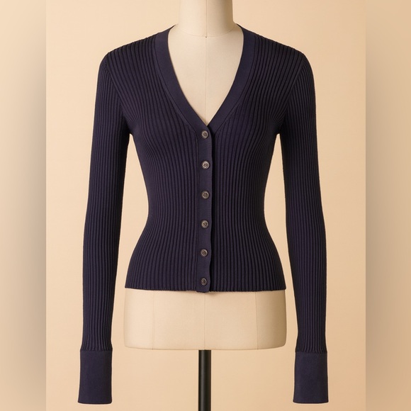Elegant ribbed cardigan. Deep V-neckline. Button-up front. Long sleeves.