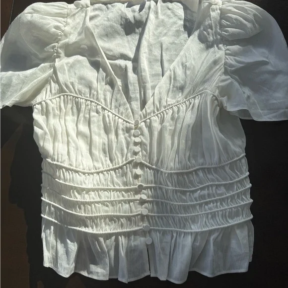 Chic white blouse with ruched detailing. Short puff sleeves and button-up front. Perfect for versatile styling.