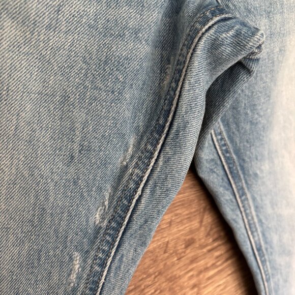 Frame Jeans The Low Boot in size 31 for women feature a biodegradable denim fabric with distressed accents and a 5-pocket design. The mid-rise jeans have a classic fit, and an inseam of 30 inches. The medium-light wash jeans in blue color are made of 100% cotton by the brand FRAME, showcasing a bohemian, city, and preppy style.