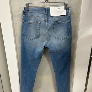 New with tags, never worn. We love this Skinny de Jeanne Crop from Frame, which features a super stretch denim that are expertly distressed at the knees and frayed at the hem for a completely lived in look.
