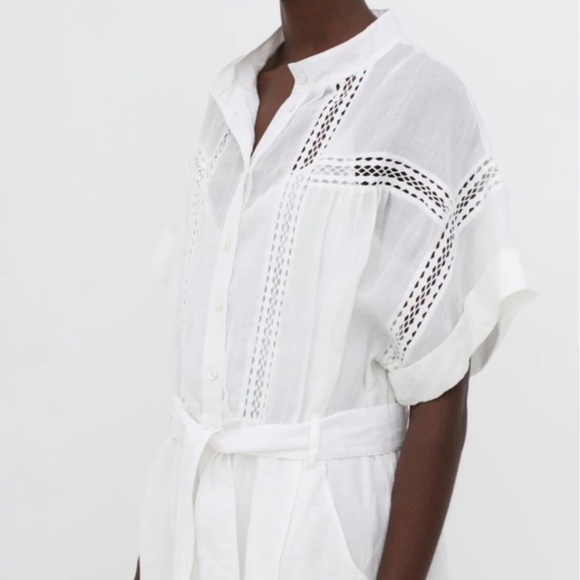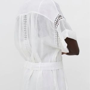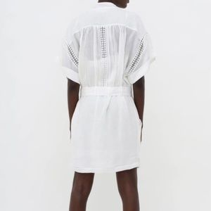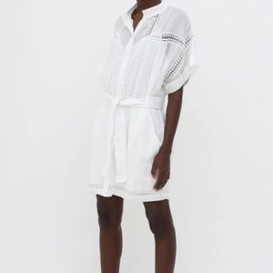 Pre-owned belted white eyelet mini-dress featuring open lace details throughout, cuffed short sleeves, dual front hip pockets and front button closures. Detachable lining.