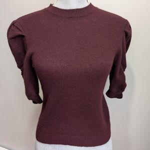 This sweater has a crew neck, puff sleeves and a ruched detailing on the sleeves.