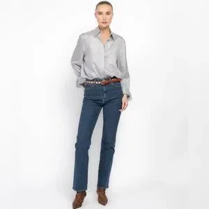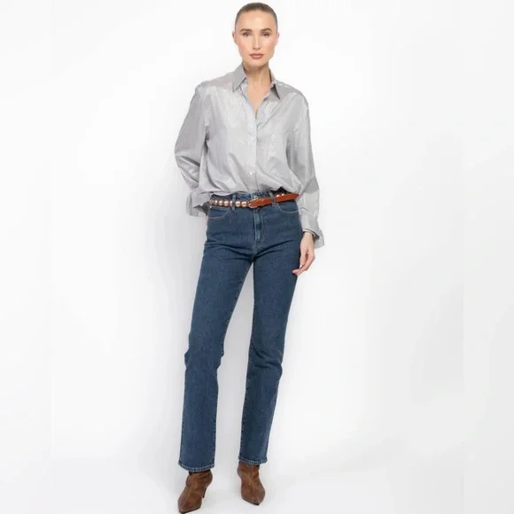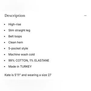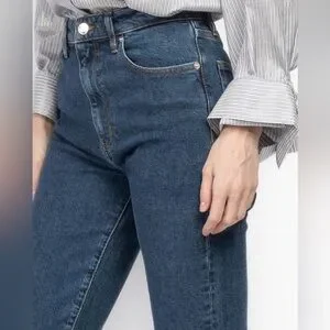 High-rise slim straight leg jeans with belt loops and clean hem. Features a 5-pocket style. Made from 99% cotton and 1% elastane