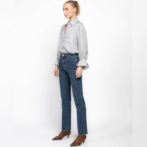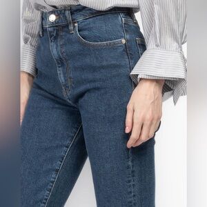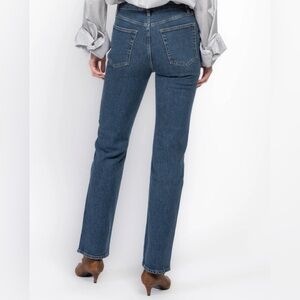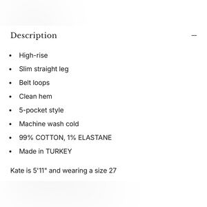 High-rise slim straight leg jeans with belt loops and clean hem. Features a 5-pocket style. Made from 99% cotton and 1% elastane.