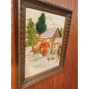 This product is a handmade framed cross stitch piece from the 1970s, featuring a scene of an old mill on a stream.