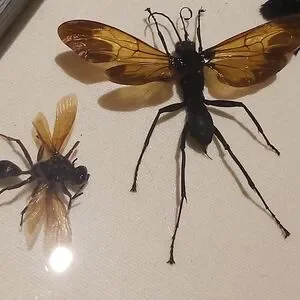 Unique framed display featuring one giant wasp, one large wasp and a giant hornet. This one of a kind Art piece is a great addition for any collection for enthusiasts.