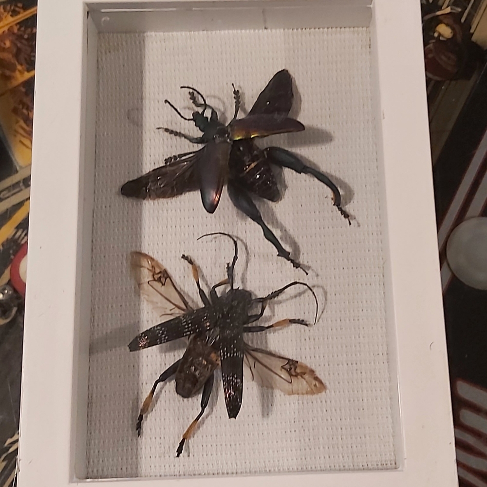 Unique framed display in a shadow box featuring two real insect specimens. Perfect for collectors and enthusiasts.