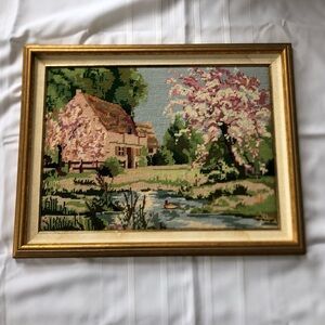 Enhance your home with this beautiful framed landscape tapestry art. Featuring a serene scene with a gold frame, this piece adds elegance to any room.