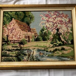 A barn can be seen on the left side of the piece and a large tree on the right with a pond and ducks in the centre.