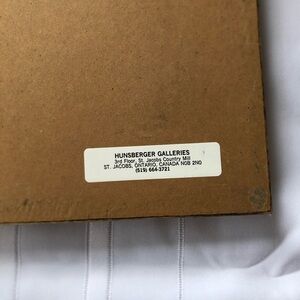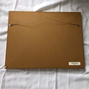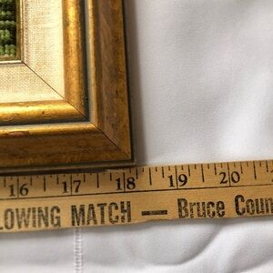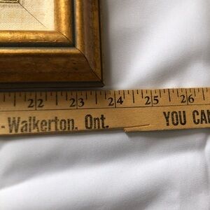 Framed with a gold and off white fabric style frame. Measurements are: 23 3/4” x 18 1/4” to the outside of the frame.