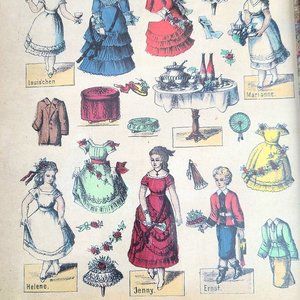 Sheet of Victorian Paper Dolls Printed in Germany JFS-72360. Children's ball. 11'' x 9''. I wooden frame. covered with glass. Great condition.