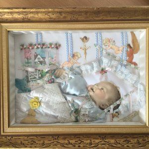 It is a vintage 1975 wall art framed 3D mixed media with a baby, very unique handcrafted by a Canadian artist.