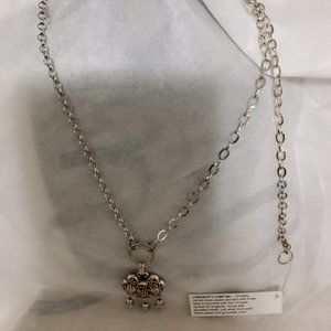 Fran Green lives in Ottawa. The necklace measures about 40 inches. Silver plate and gunmetal. NWT.