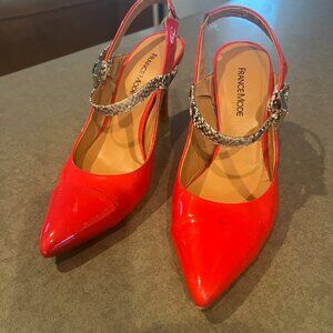 France Mode Red Patent Heel Slingbacks with Snakeskin detail on strap, adjustable silver buckle, toe cap. Good condition; a couple minor scuffs per photos, but not very noticeable. Very comfortable. Heel height 3.25 inches. These fit on the larger side, and would easily fit size 6.5 and small 7s.