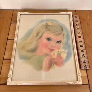 Vintage Frances Hook for Northern Paper Mills framed art print of a blonde girl holding yellow flowers. Wooden frame is painted in a cream/off-white shade and has carved detail at each corner. Frame size is 11 1/2" x 14 1/2". Pre-owned vintage condition: wood frame has scratches/indents to painted surface. Backing paper is ripped in a few sections.