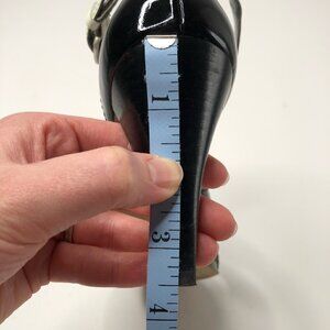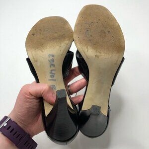 Franco Sarto shiny patent leather upper black, cream and silver colorblock heels. These peep-toe square toe front sandals have a t-strap design going up the shoe, with a cap heel and an ankle strap and silver buckle closure. 3 1/2” heel. In really great used condition with only a few small scuffs, signs of wear and normal wear to soles. See photos for details and measurements. (The "orange scuff" in the third picture is just a light reflection). Women’s size 7M.