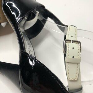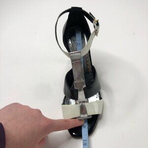 Franco SARTO Shiny Black Silver Patent Leather T-Strap Colorblock Sandal Heels