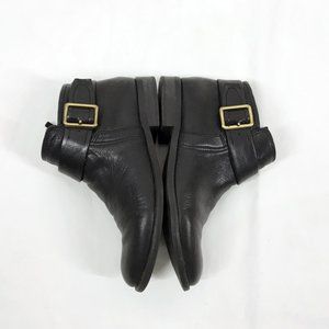 Black leather ankle boots with belt and buckle detail and side zippers. Actually a bit lower than an ankle boot. Round toe and rubber soles. Marked as a size 8.5M but run a bit smaller IMO so please go by measurements below as everyone's feet differ.