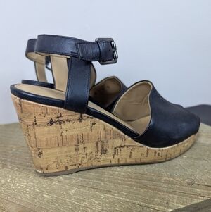 Franco Sarto Black Leather Cork Wedge Sandals Women’s 7 Ankle Strap Platform