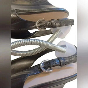 Black leather slingbacks, these wedge style shoes feature adjustable buckles and pointed toes.