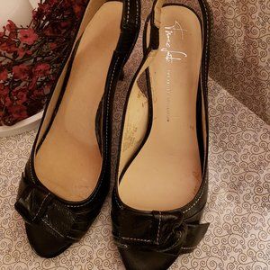 Franco Sarto Dark Navy Leather Sling Back Heels With Bow Toes 9 M