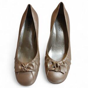 Elegant bow detail for a polished look. Comfortable 2" kitten heel for all-day wear. Versatile metallic finish to pair with many outfits