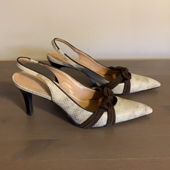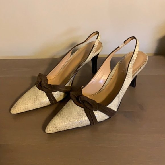 EUC Franco Sarto “Solo” cream snake print leather pointed toe sling back kitten heels with brown suede bows in women’s size eight.