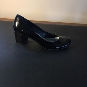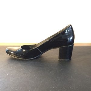 Black patent leather pumps, chunky 2 inch heel, shallow vamp. Slight wear marks on inside of heels.
