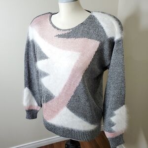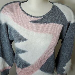 Pink, white, grey 80s crewneck pullover zigzag pattern oversized sweater