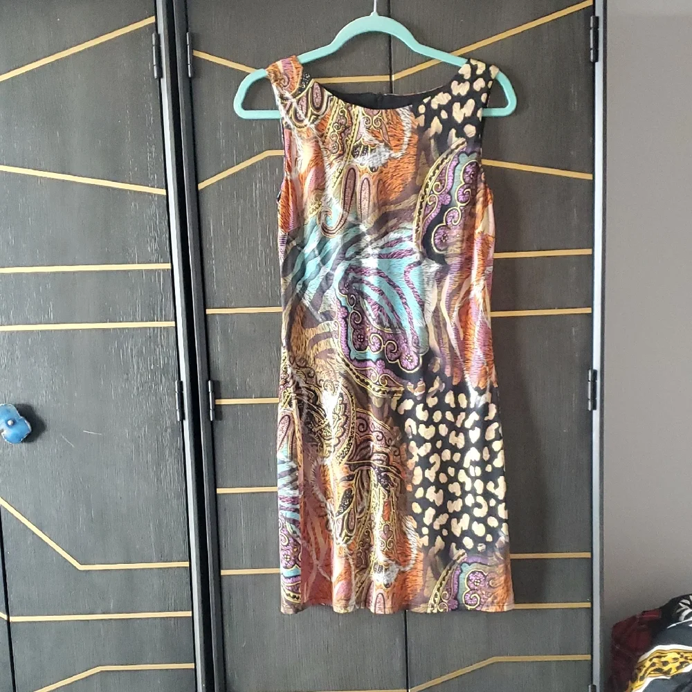 This vibrant sleeveless dress features a stunning multicolor pattern, perfect for any occasion. The bold design and comfortable fit make it a must-have addition to your wardrobe.