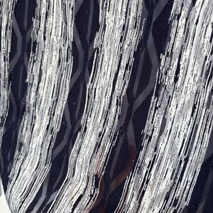 Elegant sleeveless blouse by Frank Lyman Design featuring a vertical stripe pattern in grey, white, and black with a subtle geometric overlay. Soft and flowy material with a keyhole neckline. Shows minor signs of pilling (see photos). PTP: 23in | Length: 27in