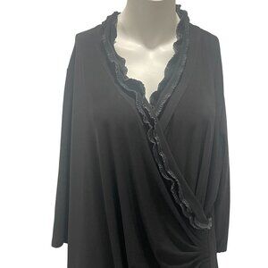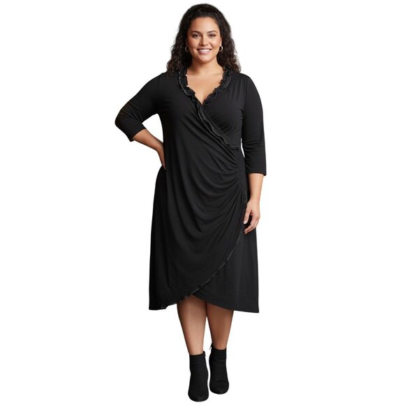 Frank Lyman Black Faux Wrap Midi Dress Lace Trim ¾ Sleeve Ruffle Cocktail Sz 18
