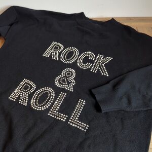 Black pullover top featuring superimposed "Rock & Roll" embellishment in silver studs.