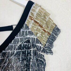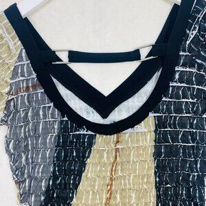 Frank Lyman Blk/Tan Ruffle Butterfly Short Sleeve Top V Neck/Scoop Back Wms Sz 6