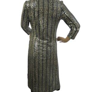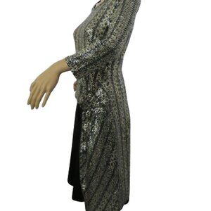 Illuminate your wardrobe with the Frank Lyman Design gold and black sparkling top, a dazzling piece that combines sophistication with a touch of glamor. This top features a radiant gold and black sparkle that catches the light beautifully, making it a perfect choice for both evening events and special occasions. The high-low hemline adds a modern twist, creating a dynamic silhouette that moves gracefully with you. Designed with 3/4 sleeves and a round neckline, the top offers a classic and versatile style that complements a variety of looks. A unique sash side detail introduces an element of elegance and interest, enhancing the top’s overall design. Crafted from stretch fabric, it ensures a comfortable, flattering fit that adapts to your shape, providing both style and ease of movement. This sparkling top is sure to be a standout piece, adding a touch of luxury and sophistication to your wardrobe. Pairs well with black leggings or a pencil skirt.