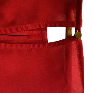 Frank Lyman Design red crepe blouse with peekaboo opening at chest and in back. Has a front tie. offers effortless sophistication with a billowy flattering fit perfect for both work and evening occasions. Style with tailored trousers or a pencil skirt to create a polished, elegant look. The material is wonderful, great for the suitcase/travel, , hard to crease. In excellent condition worn once.