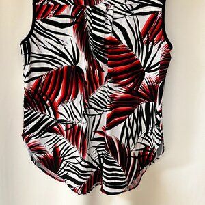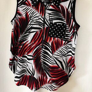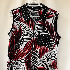 This is a Frank Lyman Dress tank top. This is a part of their Design Collection. It has a front zipper and one breast pocket. Scooped hem front and back. It has a leaf design and the pocket is polkadot. Size 12 woman’s. Fabric is a stretchy knit. Gently used.