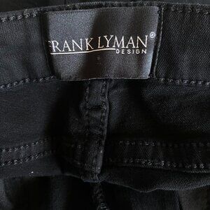 Frank Lyman Black Jeans. High Waist Clear Rhinestone, faux silver Pearl, & sparkly studded ankle hem. Fits 4-6. Fabric & size tag removed, but is a stretch cotton & spandex blend, 5 pocket style. Measurements shows it will fit sz 4 & 6 because of the great amount of spandex.